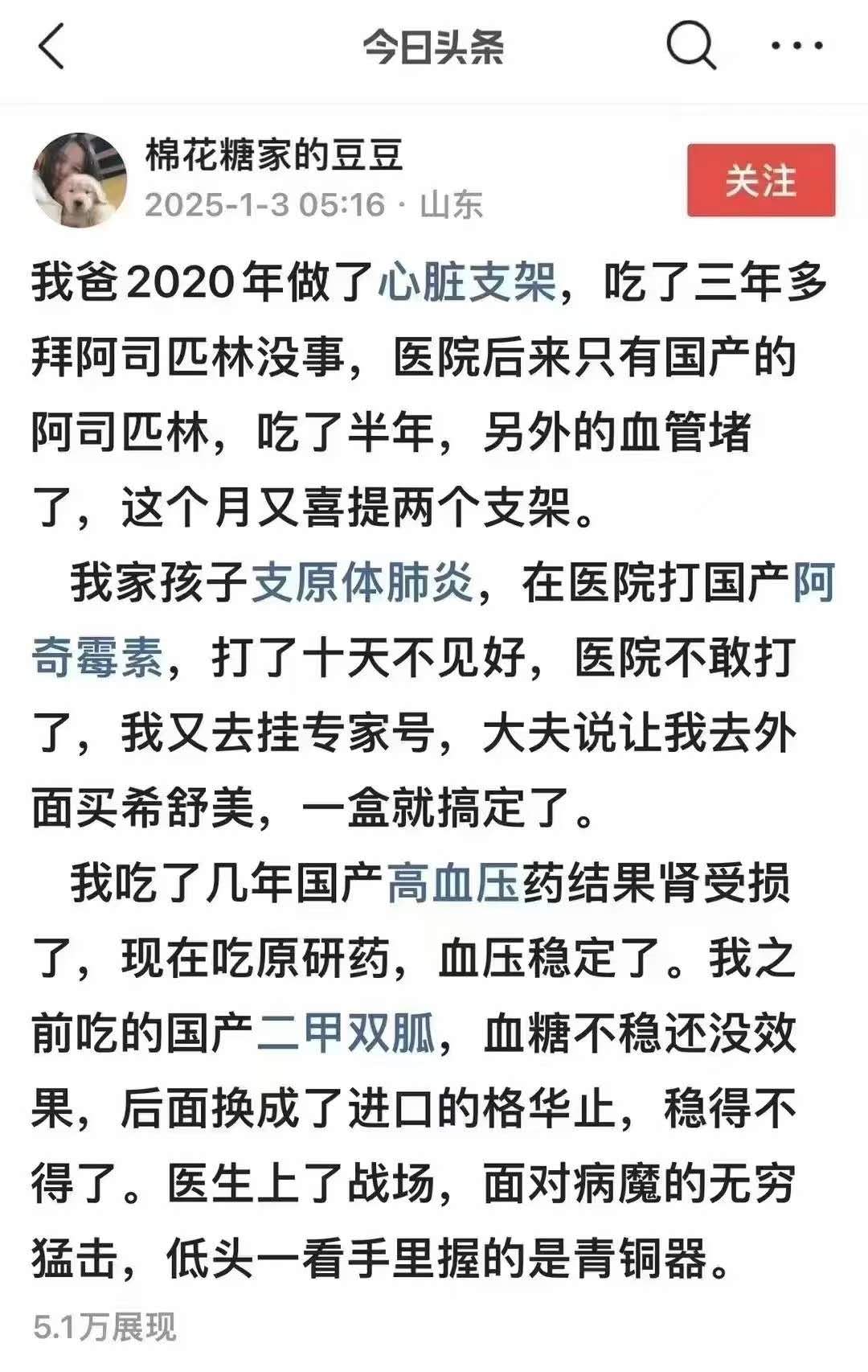 其实出现这种情况并不奇怪,国内药品生产企业在提纯和生产工艺方面都不如发达国家,而在集采压力下,为了生存,企业只能将价格压至最低,药效反而成了次要问题,真有点本末倒置的意思。假药令人愤怒,但质量低劣的“真药”或许危害更大。这种现象的最终买单者,仍然是普通百姓。